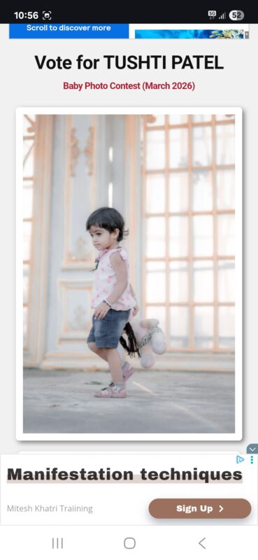 Oops! You missed the chance to win a participation certificate by 498 votes! But do not worry, your little star Tushti patel still has a chance to shine! Join the next contest and give your baby another opportunity to win amazing prizes like a surprise gift & certificates for achivement and participation. Participate again & keep the winning spirit alive!