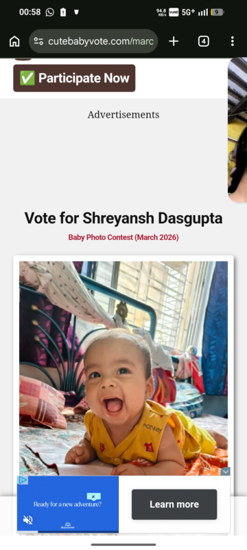 Oops! You missed the chance to win a participation certificate by 494 votes! But do not worry, your little star Shreyansh Dasgupta still has a chance to shine! Join the next contest and give your baby another opportunity to win amazing prizes like a surprise gift & certificates for achivement and participation. Participate again & keep the winning spirit alive!